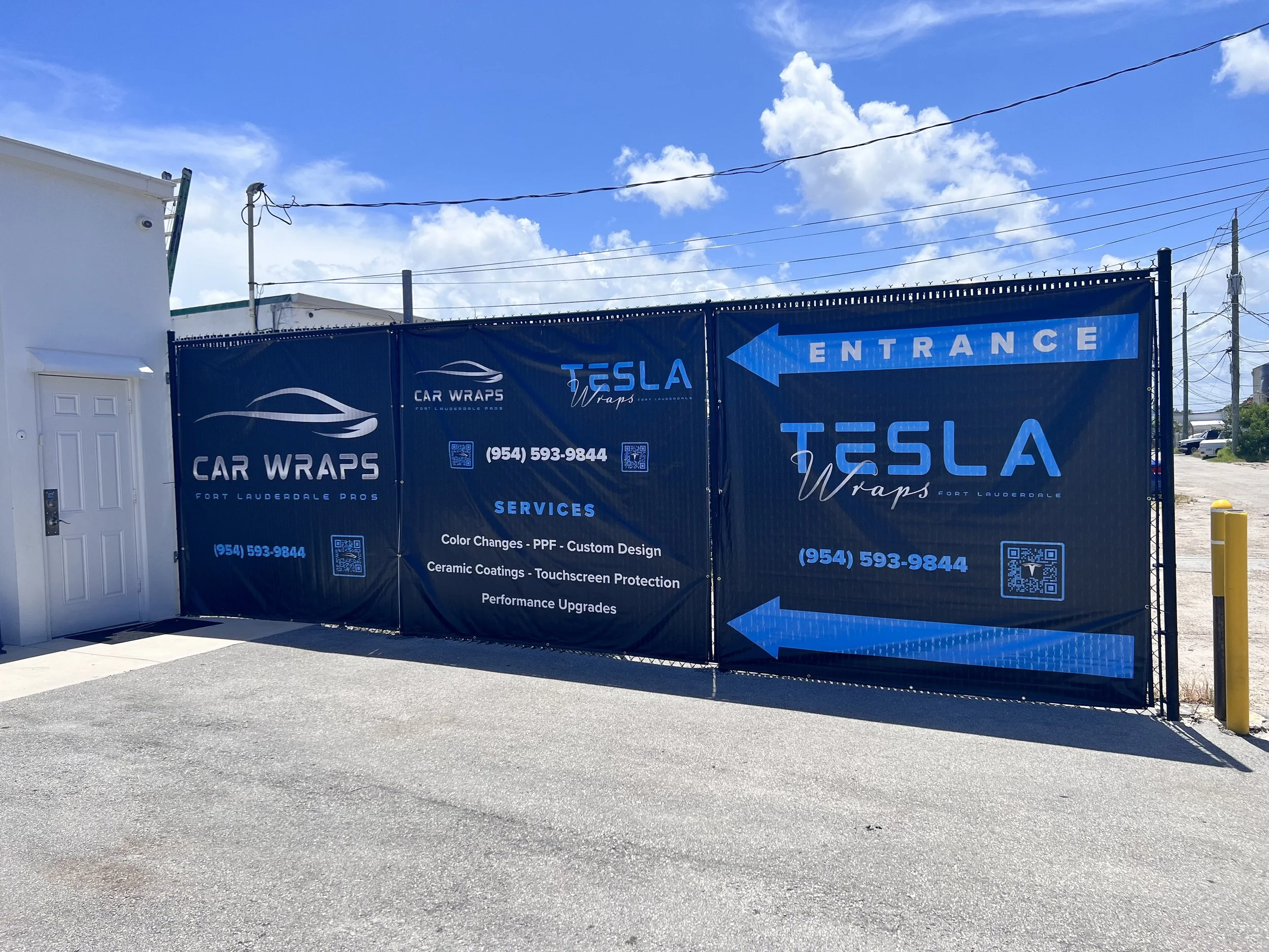 Custom Oversized Banners, so customers can easily identity the shop location and also block the view of the property on the opposite side of the fence, was the perfect solution for Tesla Wraps Fort Lauderdale.